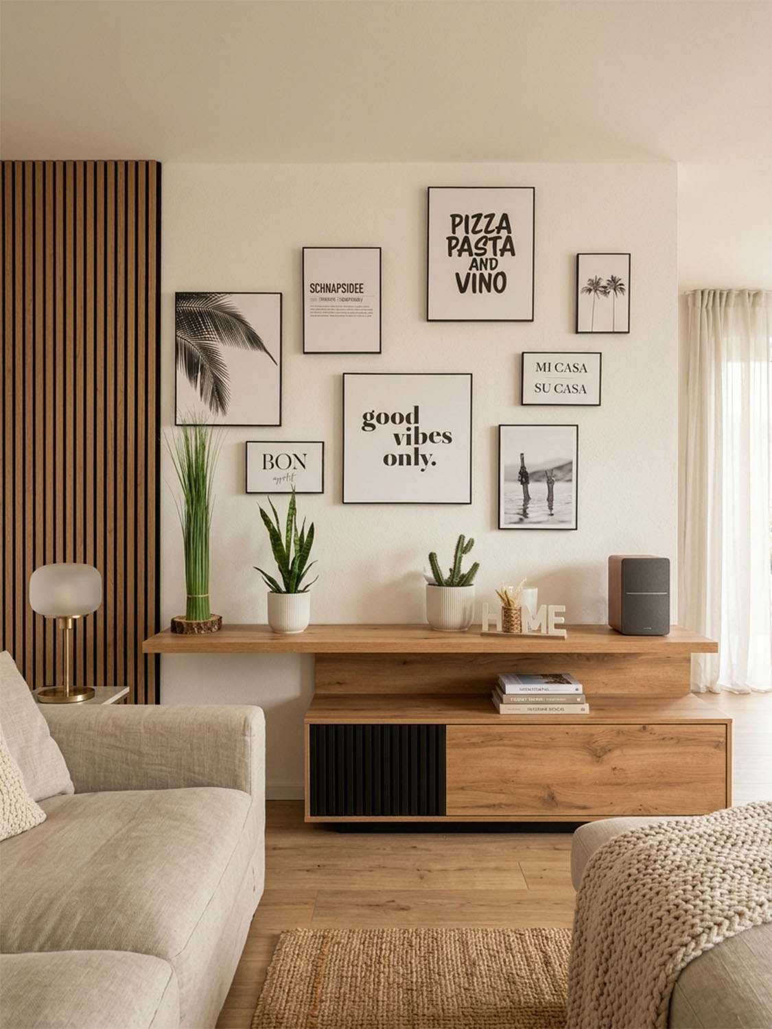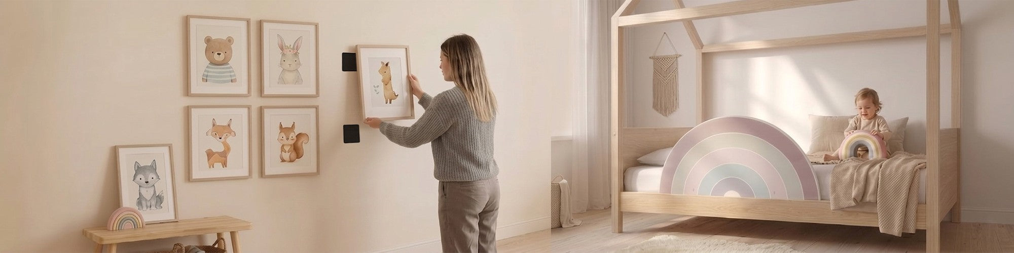 Stilvolle Bildercollagen bringen Persönlichkeit ins Wohnzimmer — mühelos montiert und jederzeit neu arrangierbar. Unser Magnetsystem macht Dekorieren flexibel, sauber und überraschend einfach.